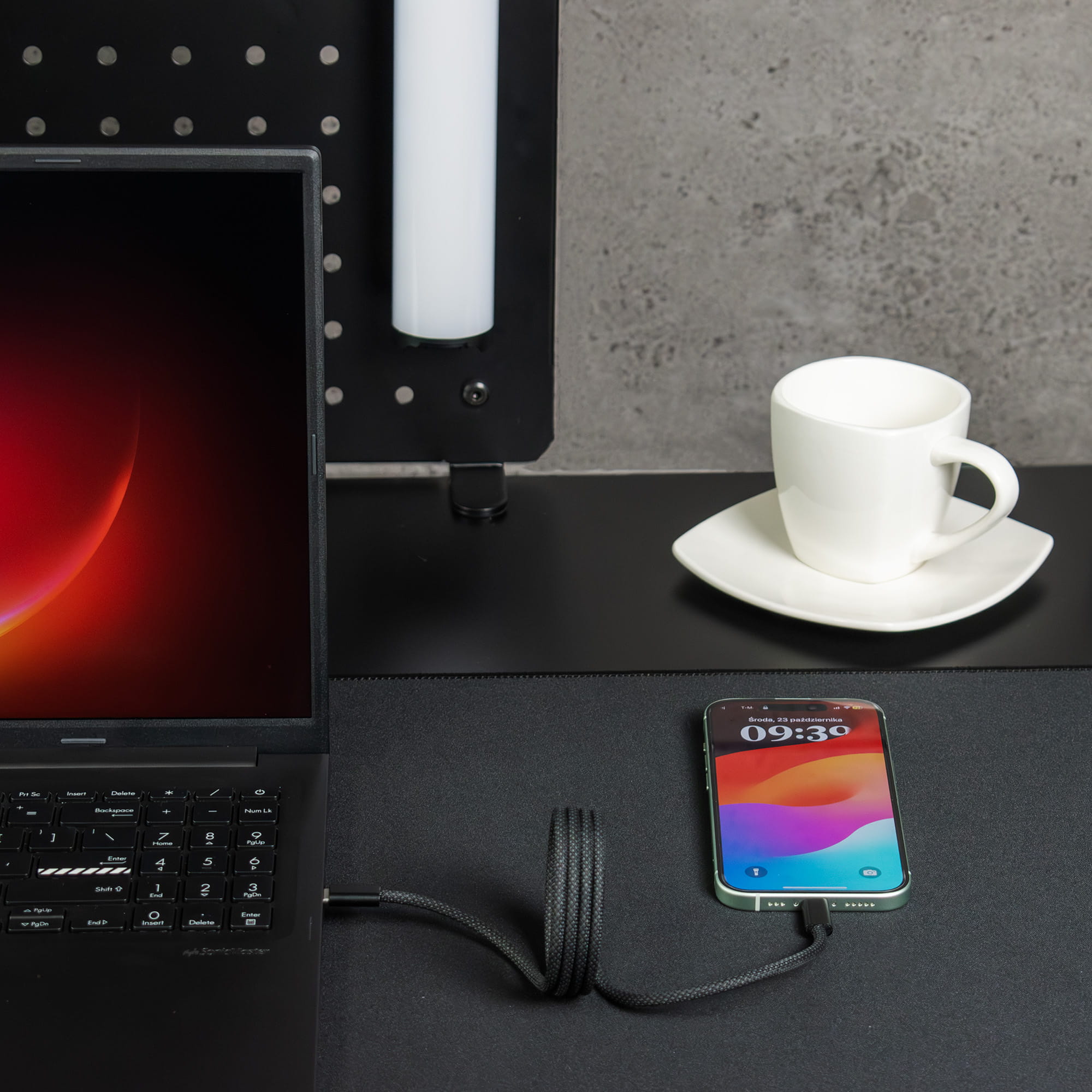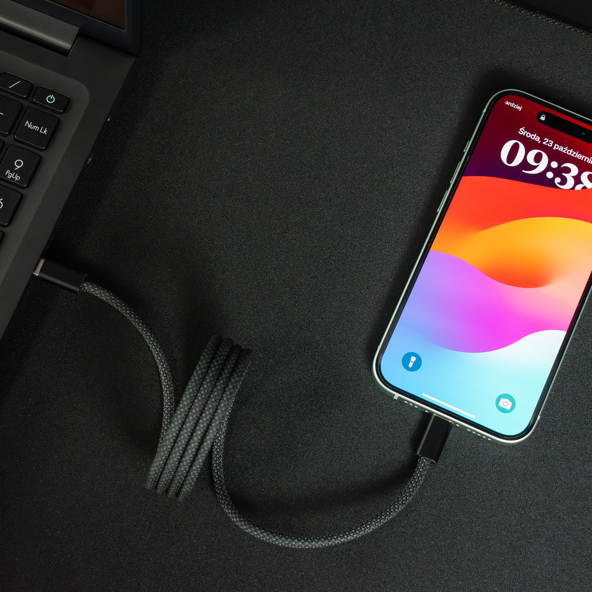 Kabel Lightning – USB-C od LVN System w stylowym czarnym oplocie to idealny gadżet, jeśli lubisz porządek na swoim biurku i w swoim plecaku lub torbie.