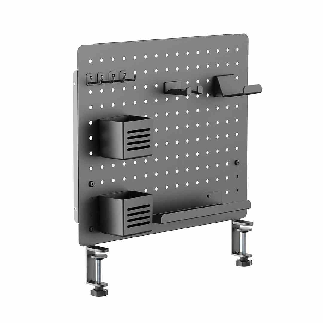 Zero wkrętów. Zero gwoździ. Zero wiercenia. Zero pyłu i kłopotu. Nie szpecisz ścian, nie robisz w nich dziur, nie zastanawiasz się, czy aby na pewno jest prosto. Pegboard PG1 przytwierdzasz do blatu biurka na regulowane uchwyty. Dwa uchwyty. To zapewnia stabilność i jest wyrazem troski o blat. W dodatku gdy zmienisz zdanie, szybko przeniesiesz organizer w inne miejsce. A nawet na inne biurko.