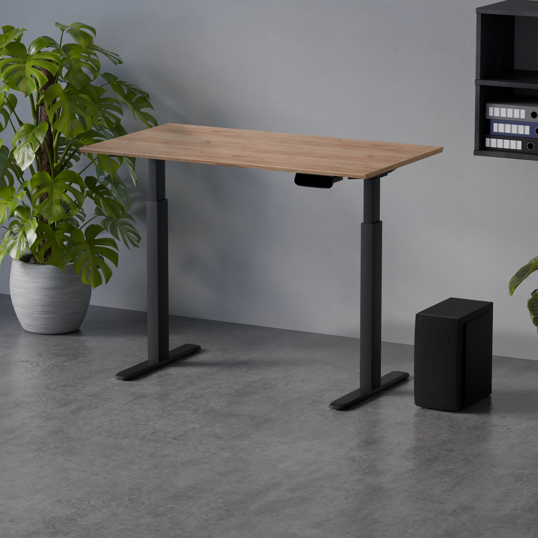 Blat wykonany z jednego elementu o wymiarach 120 na 67 cm i grubości 1,8 cm tworzy stabilną powierzchnię roboczą. Maksymalne obciążenie do 100 kg pozwala na korzystanie z rozbudowanych konfiguracji sprzętowych. Kontroler z wyświetlaczem umożliwia zapisanie trzech ustawień wysokości i ich szybkie przywołanie. Wbudowany port USB o mocy 10 W pozwala ładować urządzenia bezpośrednio przy biurku.