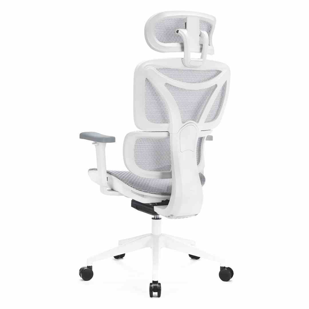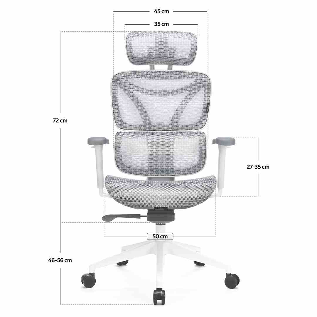 Siedzisko wykonane jest z miękkiej tkaniny, natomiast oparcie z oddychającej siatki mesh zapewnia cyrkulację powietrza. Podłokietniki 3D oraz regulowany zagłówek umożliwiają dokładne dopasowanie pozycji. Fotel posiada udźwig do 130 kg oraz stabilną pięcioramienną podstawę z cichymi kółkami.