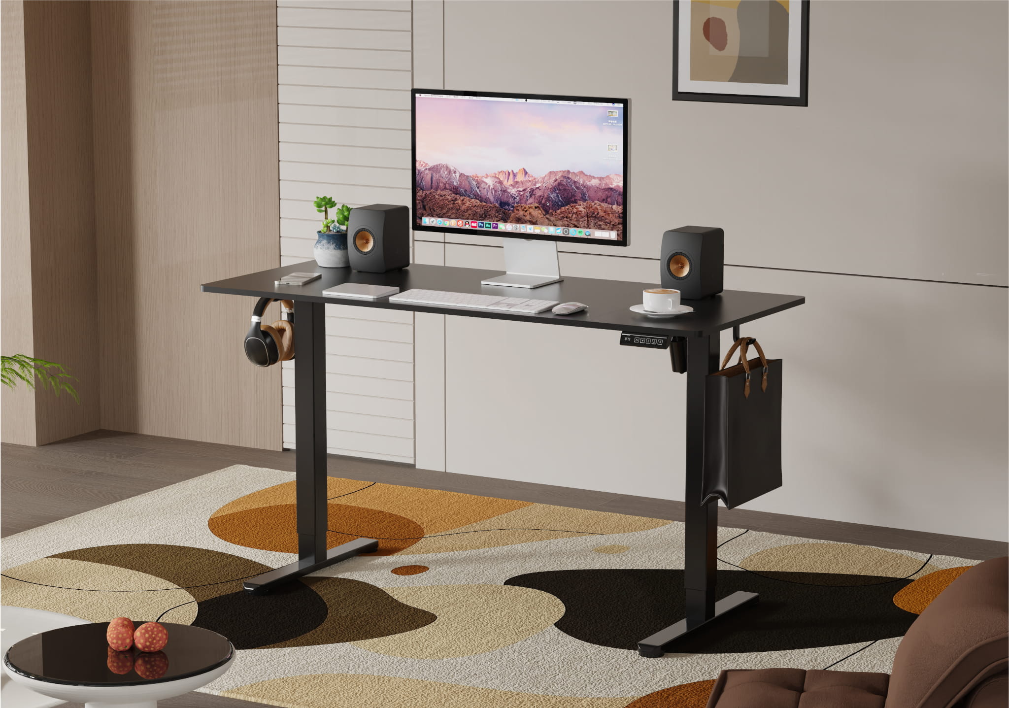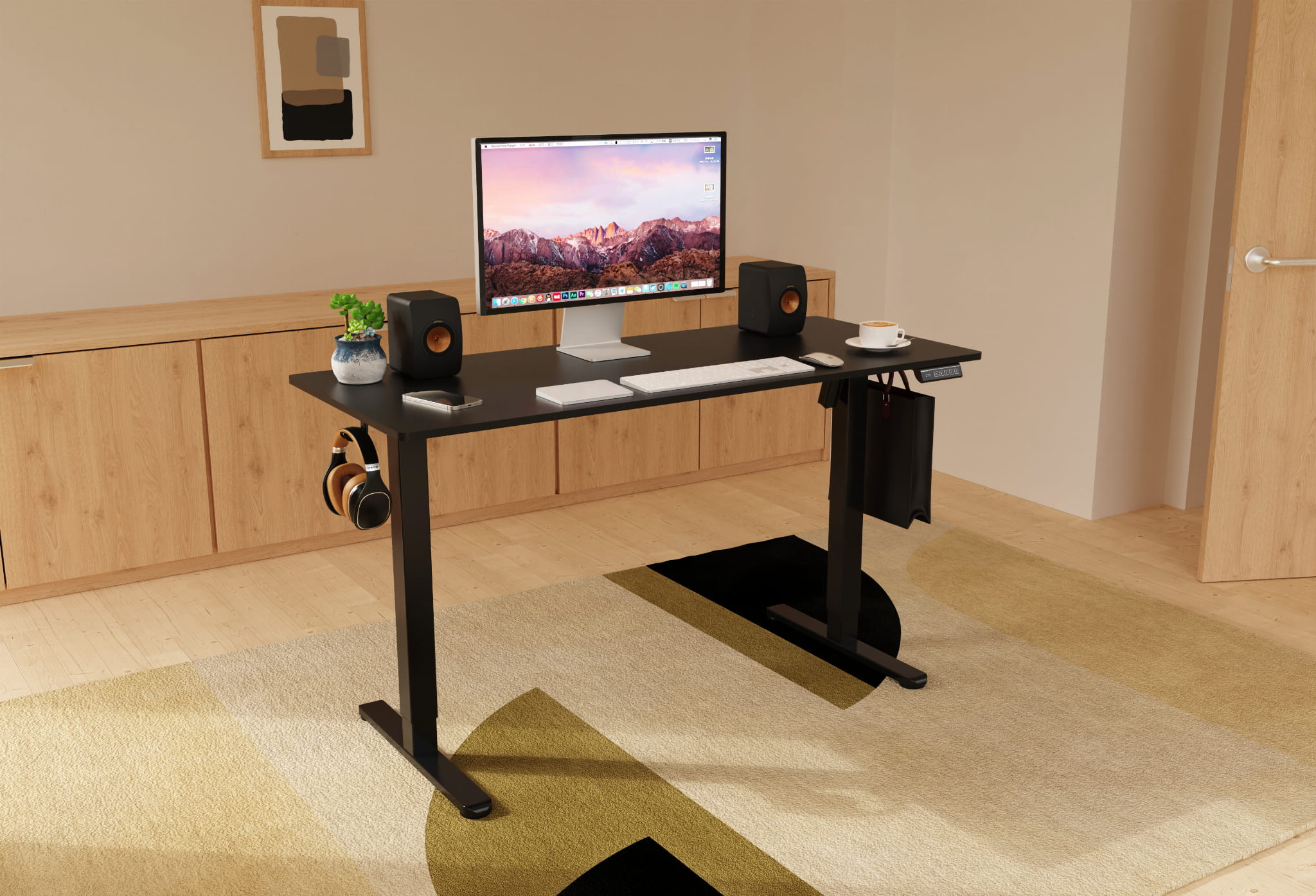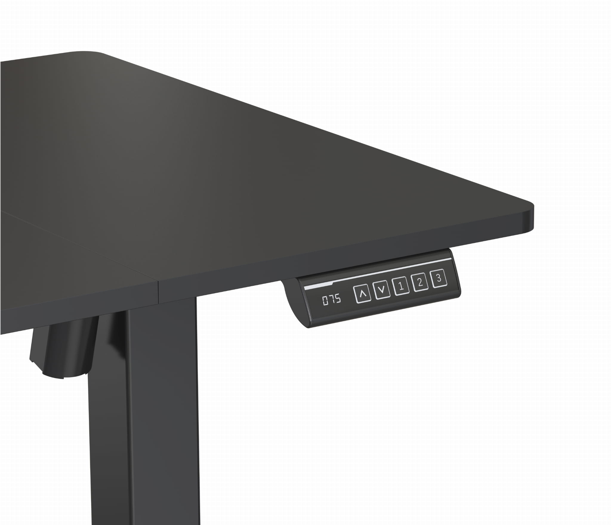 Kontroler z wyświetlaczem umożliwia zapisanie trzech wysokości i ich szybkie przywołanie. Może być zamontowany po dowolnej stronie blatu, co pozwala dopasować układ do własnych preferencji. Biurko wyposażone jest również w haki na akcesoria oraz klipsy do prowadzenia przewodów. Dzięki temu stanowisko pracy pozostaje uporządkowane i funkcjonalne.